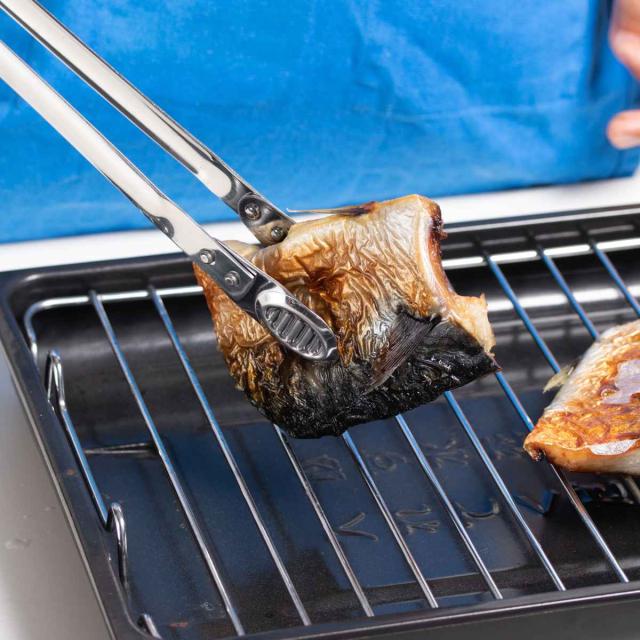 長く、熱くなりにくいステンレス製のトングは、さいばしのようにしっかり掴め、しなることなく子どもの力でも滑らずしっかり食材を掴めます。