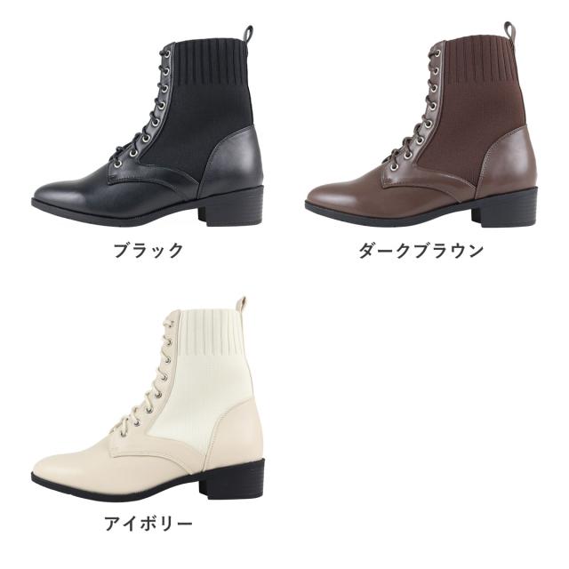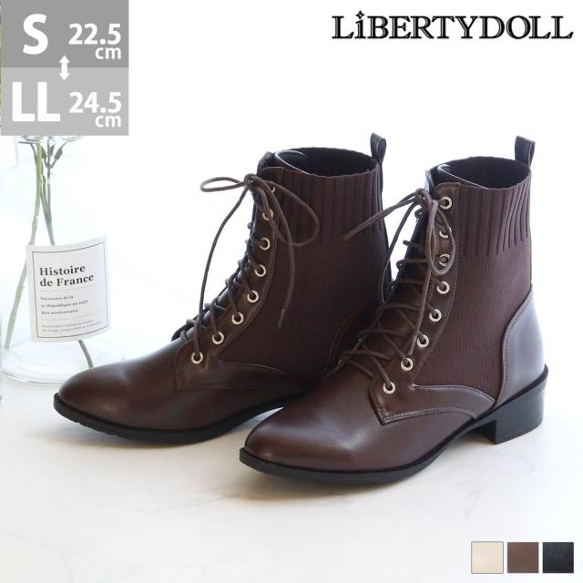 レースアップブーツ レディース アーモンドトゥ 軽量 太ヒール ショートブーツ 8ホール 防寒 美脚 4cmヒール No.9074 22.5cm〜24.5cm 黒 ブラック 茶 ダークブラウン アイボリー LiBERTYDOLL リバティードール