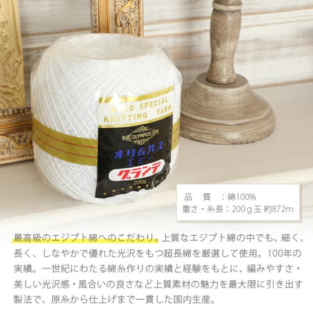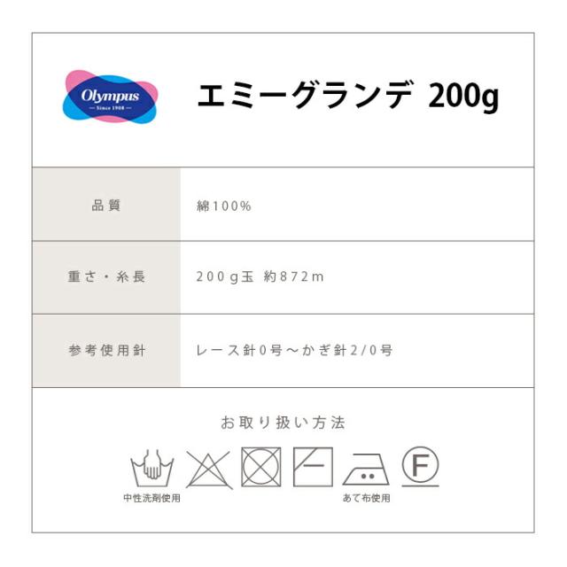 レース糸 オリムパス エミーグランデ 200g レース糸 20番 #20 日本製 コットン 綿100% レース針 かぎ針 レディース レース編み 手編み 編み物 手芸 ハンドメイド 手作り 帽子 ショール ストール セーター ベスト