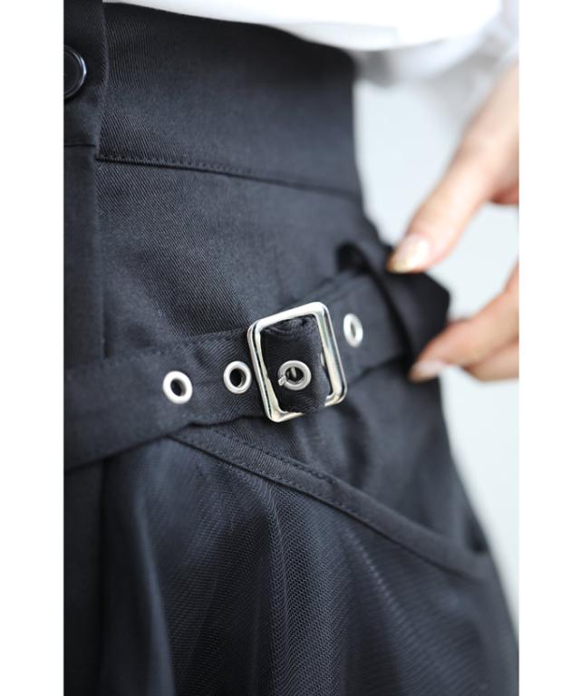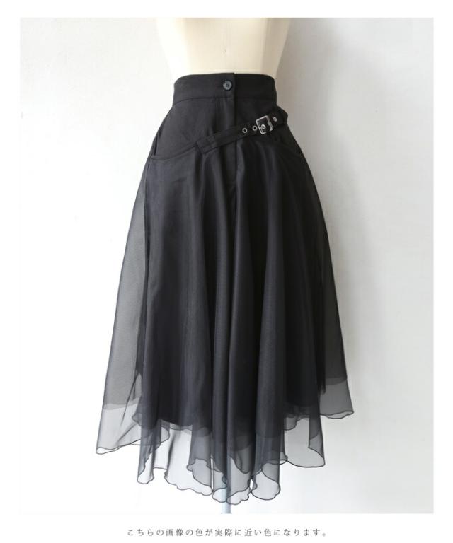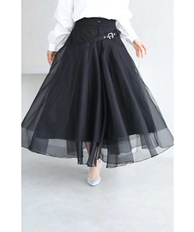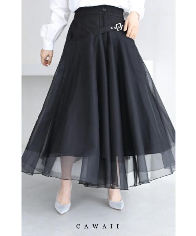【閉店SALE】 (S~L対応)(黒)オーガンジーベール広がるベルテッドロングスカートベルテッド cawaii wk00427 スカート ロング丈 マキシ丈 ウエストゴム ベルト フレアスカート 黒 入学式 卒業式 フォーマル オフィス お呼ばれ 秋 母の日 春 夏 パーティー