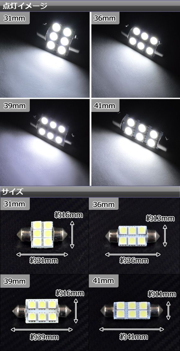 457593380 T10×31mm AP-T10-6LED-31 T10×36mm AP-T10-6LED-36 T10×39mm AP-T10-6LED-39 T10×41mm AP-T10-6LED-41 4562430400172 4562430400189 4562430400196 4562430400202 LED ルームランプ ルームライト ルーム ランプ ライト マップランプ マップライト 室内灯 車内灯 室内 車内 バニティ バニテイ カーテシ フット ラゲッジ ラゲージ トランク フロント T10 31mm 36mm 39mm 41mm 6発 6個 6灯 24ボルト 照明 電球 電灯 発光 枕球 まくら球 マクラ球 ホワイト 白 white 内装 内装パーツ パーツ インテリア ドレスアップ イルミネーション カスタム トラック バス オートモービル モーターカー カー 車 自動車 サイズ 31MM 31ミリメートル 36MM 36ミリメートル 39MM 39ミリメートル 41MM 41ミリメートル AP-T10-6LED-T1031 AP-T10-6LED-T1036 AP-T10-6LED-T1039 AP-T10-6LED-T1041