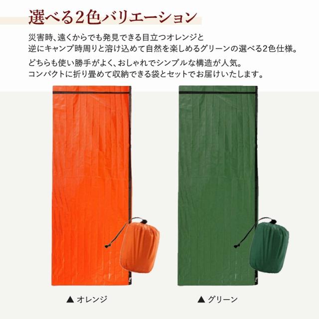 災害時、遠くからでも発見できる目立つオレンジと逆にキャンプ時周りと溶け込めて自然を楽しめるグリーンの選べる2色仕様。