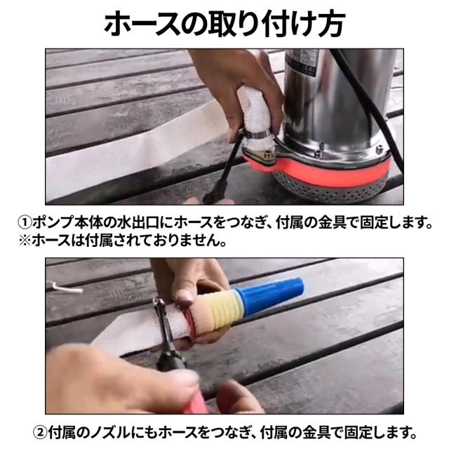 1.ポンプ本体の水出口にホースをつなぎ、付属の金具で固定します。