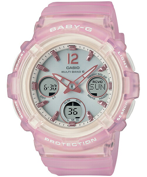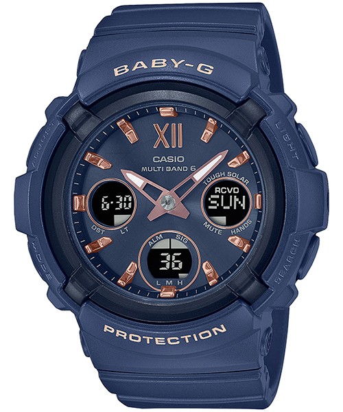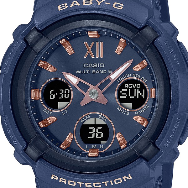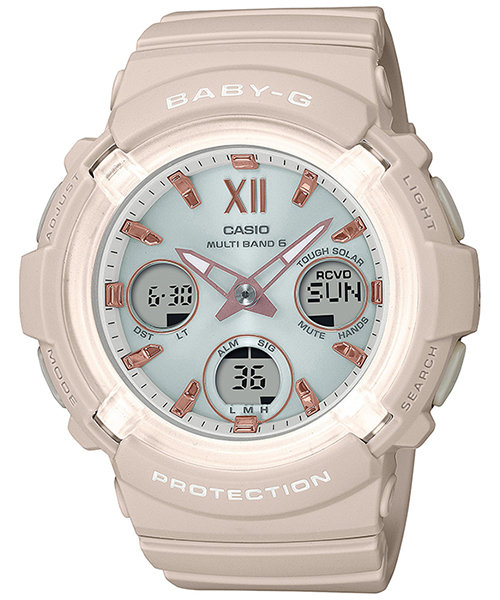 ボリューム感のあるフォルムのBGA-2800シリーズに、様々なコーディネートに取り入れやすいくすみ系のネイビーとピンクベージュをラインアップしました。機能面では、耐衝撃構造や10気圧防水、世界6局の電波を受信し時刻を自動修正するマルチバンド6、ワールドタイム、タフソーラー等、頼れる機能を備えています。