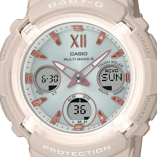 ボリューム感のあるフォルムのBGA-2800シリーズに、様 々なコーディネートに取り入れやすいくすみ系のネイビーとピンクベージュをラインアップしました。機能面では、耐衝撃構造や10気圧防水、世界6局の電波を受信し時刻を自動修正するマルチバンド6、ワールドタイム、タフソーラー等、頼れる機能を備えています。