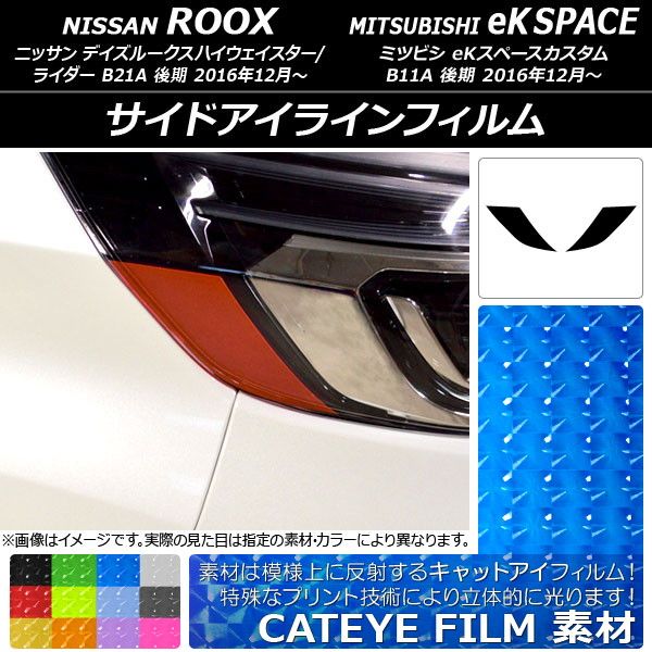 サイドアイラインフィルム キャットアイタイプ ニッサン/ミツビシ デイズ/eKスペースカスタム B21A/B11A 選べる12カラー 入数:1セット(2枚) AP-YLCT107 カラー: ブラック レッド ブルー イエロー グリーン オレンジ パープル ピンク クリア ライトイエロー ライトブルー ライトブラック