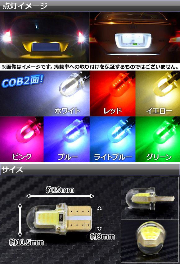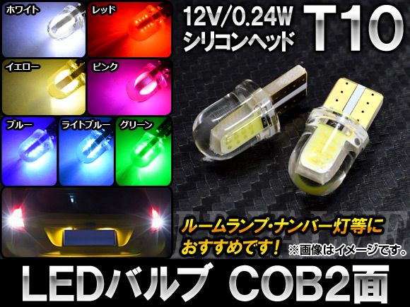 AP LEDバルブ T10 COB 2面 シリコンヘッド 12V 0.24W 選べる7カラー AP-LB020 入数:2個 カラー: ホワイト レッド ブルー イエロー グリーン ピンク ライトブルー