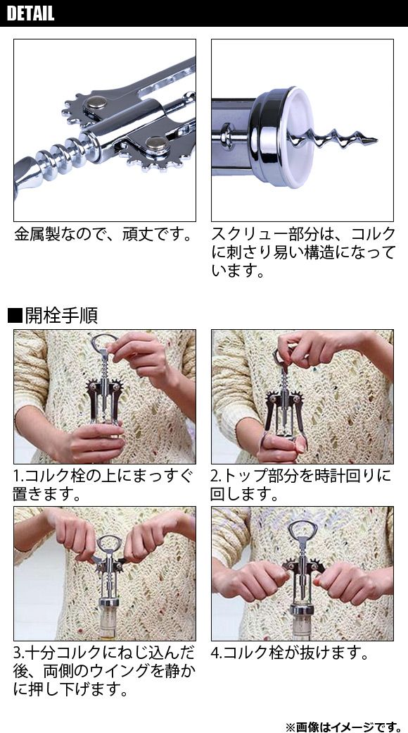 簡単、確実にコルクが抜けるウイング式ワインボトルオープナーです。