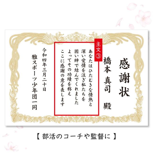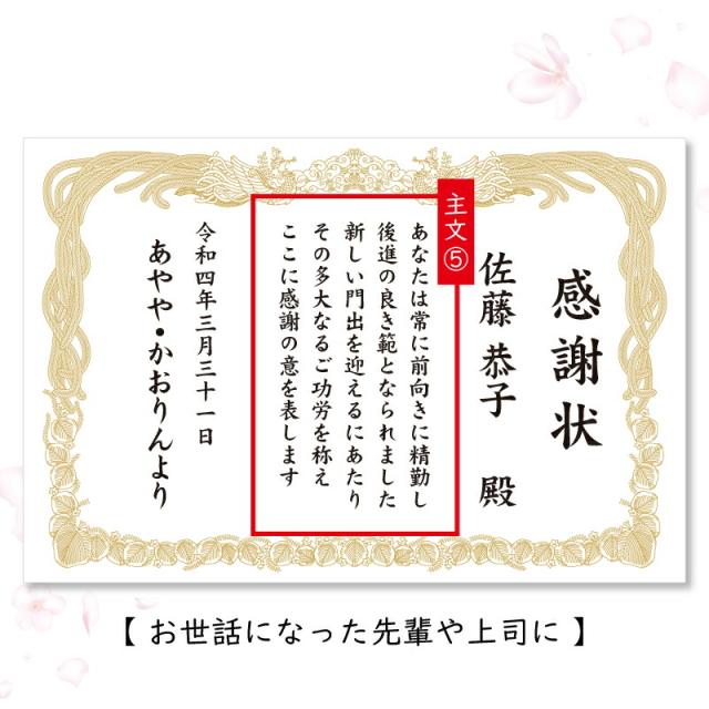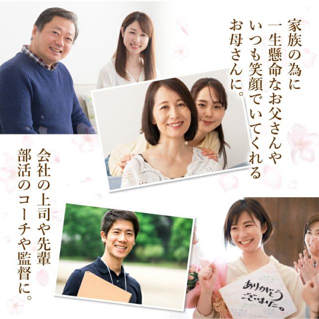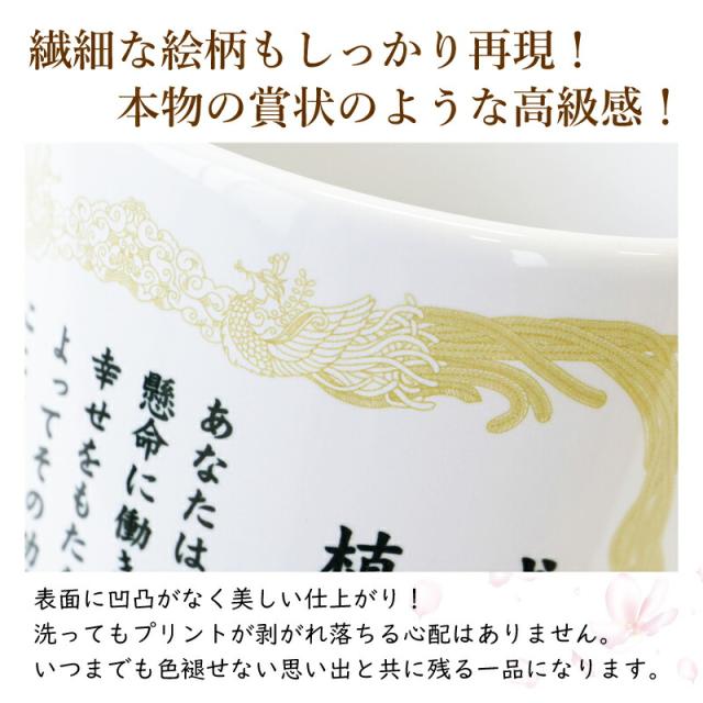 真心こめた感謝の言葉を 実用的なマグカップにして贈りましょう。 1. 感謝状マグカップ 普段なかなかもらう機会のない感謝状、 お世話になった大切な人たちへ贈ってみませんか? 心からの感謝の言葉は、何より嬉しい贈り物。 感謝状ならいつまでもその気持ちがカタチに残るから、 メッセージを読むたびに貰った瞬間の喜びがよみがえります。 でも賞状では堅すぎるし、できれば実用的なものを贈りたい… そんな願いにお応えすべく、なふだ工房から マグカップに感謝状をプリントした その名もズバリ!「感謝状マグカップ」が新登場? いつも身近にいる人だからこそ、あらためて口にするのは照れくさい。 そんな時には洒落の効いたアイテムで、気軽に想いを伝えましょう! お家のくつろぎ時間やオフィスでの休憩 、職員室でちょっと一息… 疲れを感じる日常も、感謝状マグカップなら微笑みこぼれる素敵な一コマに! 実用的なマグカップはお茶 やコーヒーを飲む機会が多い大人には最適なプレゼント♪ さらにインパクトのあるデザインは サプライズ にもピッタリです! 感動の瞬間を思い描けば、贈る側にとってもドキドキわくわくするギフトに。 2. お名前 日付 プリント 感謝状には、贈られる方・贈る方それぞれのお名前と、 記念になる日付をお入れすることが可能です。 特別感たっぷりの、世界で一つだけのオリジナルマグカップが作成できます。 - お名前 - 「 どうして名前入りが喜ばれるの? 」 普段何気なく使っている自分の名前… 贈られた品に、もし自分の名前が刻まれていたらどうでしょう。 しかも特殊な技法で彫り込まれていたり、素敵なデザインとなってプリントされていたり・・ その瞬間、贈り物は“自分だけの大切なたからもの”へと変わります。 そして贈ってくれた方の真心を感じ、自然と笑みがこぼれることでしょう。 名前はその人にとって唯一無二、かけがえのないものです。 私たちはそのお名前を大切に、贈る人、贈られる人、両方の笑顔を想いながら商品を送り出しています。 - メッセージ - 何度も読み返したくなる心温まる文章で感謝を伝えます。 いつも大きな背中を見せてくれたお父さん 優しい笑顔で見守っていてくれたお母さん 時には厳しく指導してくださったコーチや監督 一人前に育ててくれた先輩や、新たな門出を迎える上司へ… たくさんの時間と、愛情や情熱を注いで積み重ねた努力や成果の数々… 思いがけないあたたかなメッセージは、 傍で見てくれていたんだ!!と、感激するのと同時に ご自身を誇らしく思う気持ちへといざなってくれることでしょう。 - 日付 - 日付が入ることで目にするたびに記憶がよみがえる記念のプレゼントに。 思い出に残したい日付をご指定下さい。 3. クオリティ 名入れギフト専門店ならではの職人技術で印刷された感謝状プリントは、 誰もが納得するクオリティの高さ。 繊細な絵柄もしっかり再現! 本物の 賞状 のような 高級感 を感じられます。 昇華転写という技法を使って製品自体にインクを浸透させるので、 表面に凹凸がなく美しい仕上がりに。 洗ってもプリントが剥がれ落ちる心配はありません。 いつまでも色褪せない、思い出と共に残る一品になります。 ≪こんなシーンにおすすめ≫ ・お父さん お母さん へ 父の日 母の日 ギフト として ・お世話になった 担任 恩師 への 卒業記念品 として ・異動 離任 退任 する先生へのプレゼントとして ・部活 の 顧問 監督 コーチ へ の 卒部 卒団記念品 として ・上司 先輩 同僚 への 転勤祝い 栄転祝い として ・還暦 古希 喜寿 傘寿 米寿 卒寿 白寿 百寿 の 長寿祝い に |