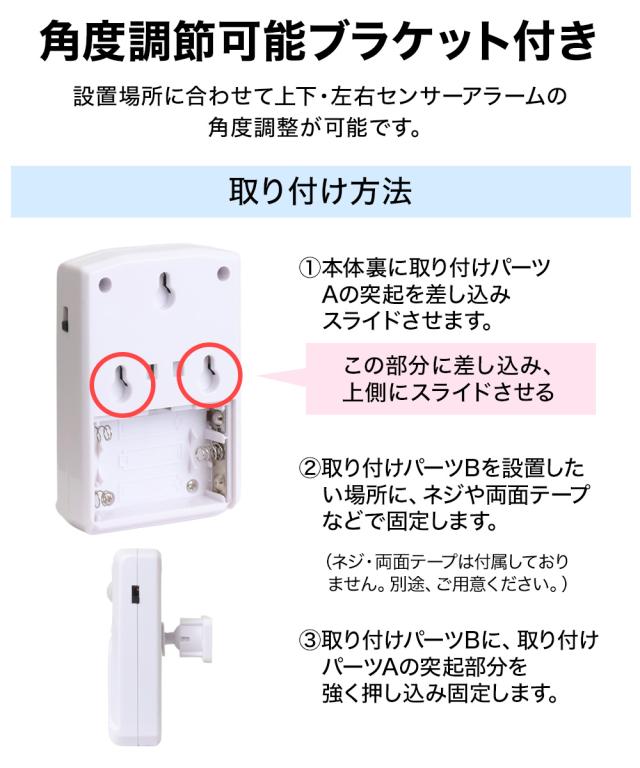 設置場所に合わせて上下・左右センサーアラームの角度調整が可能です。