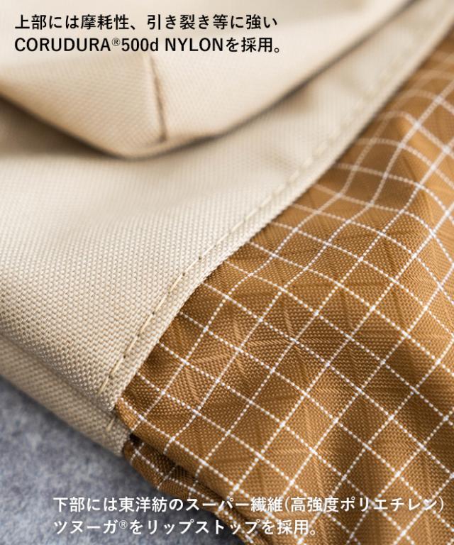 付属には同規格の210ナイロンオックスと比較しても約1.6倍相当の強度がある東洋紡のスーパー繊維(高強度ポリエチレン)ツヌーガをリップストップに織り上げた生地を使用。