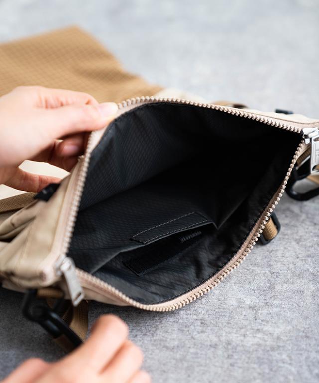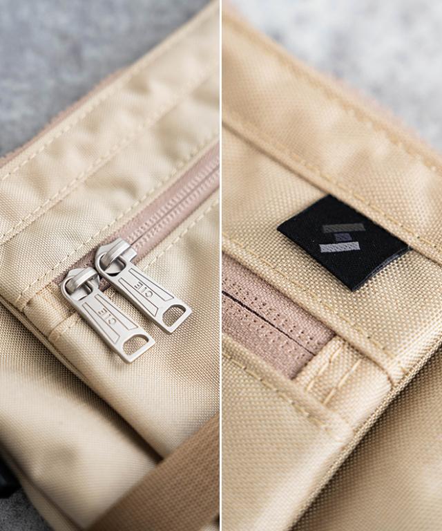 本体ファスナーにはYKK社製のVISLON WATER-Rを採用し、通常の撥水加工より持続性の高い撥水力を備え、前面のコイル裏使いにも同加工が。