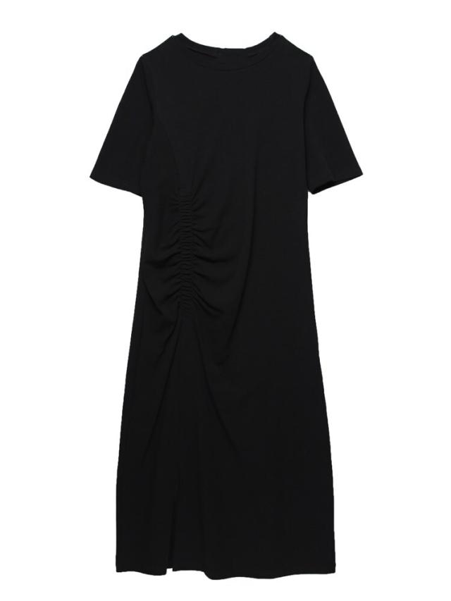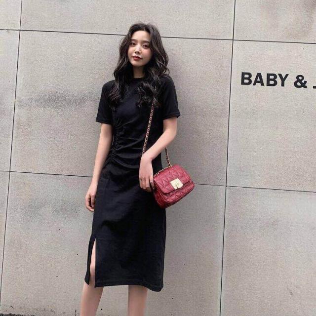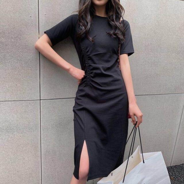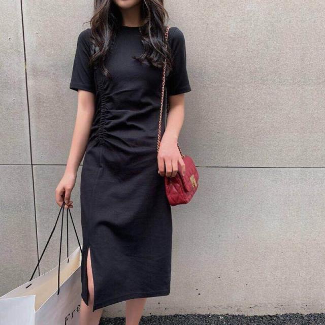 半袖スリットTシャツワンピ ワンピース Tシャツ 膝丈 ひざ丈 袖あり 半袖 Uネック ラウンドネック タイト Iライン ウエストマーク スリット シンプル カジュアル おしゃれ ラフ 無地 春 夏 10代 20代 通学 デート お出かけ 女子会 休日 海 着回し 普段使い 韓国 韓国系 オルチャン S M L 黒 ブラック