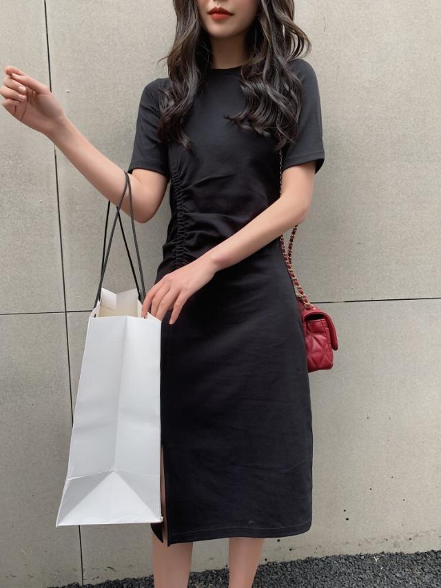 半袖スリットTシャツワンピ ワンピース Tシャツ 膝丈 ひざ丈 袖あり 半袖 Uネック ラウンドネック タイト Iライン ウエストマーク スリット シンプル カジュアル おしゃれ ラフ 無地 春 夏 10代 20代 通学 デート お出かけ 女子会 休日 海 着回し 普段使い 韓国 韓国系 オル