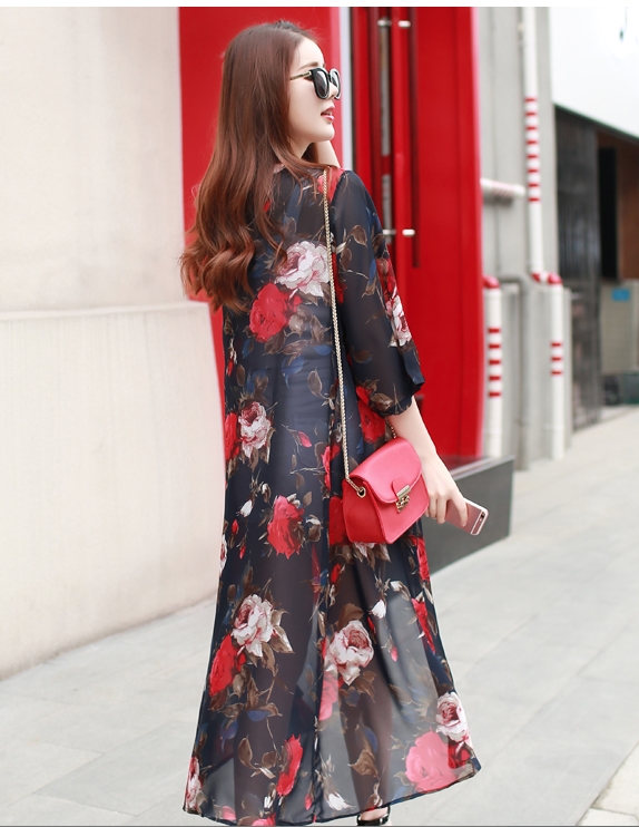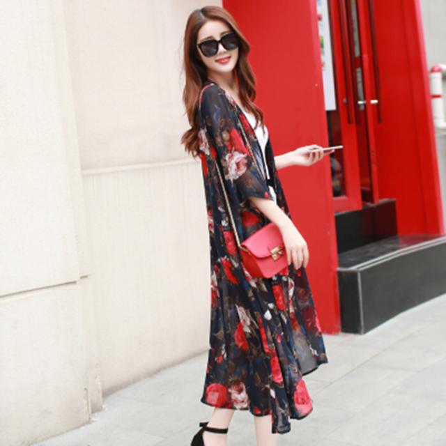 ミドル丈 シフォン カーディガン 日焼け止め ショール UVケア アウター ロング ロング丈 マキシ マキシ丈 7分袖 大人可愛い シンプル カジュアル 大人 おしゃれ アジアン エスニック 大人女子 こなれ感 柄 花柄 フラワー プリント 春 夏 10代 20代 30代 レディース OL 学生