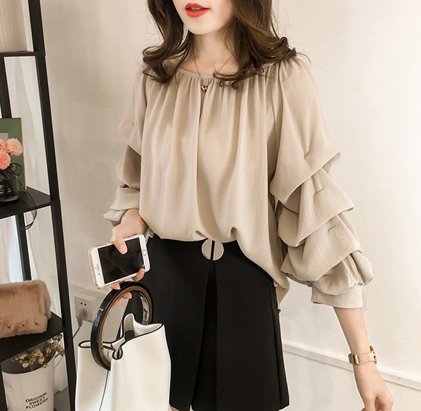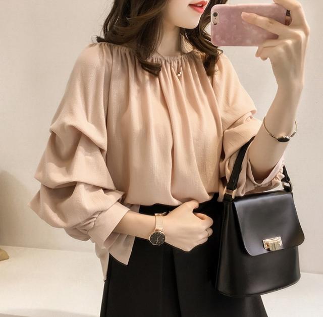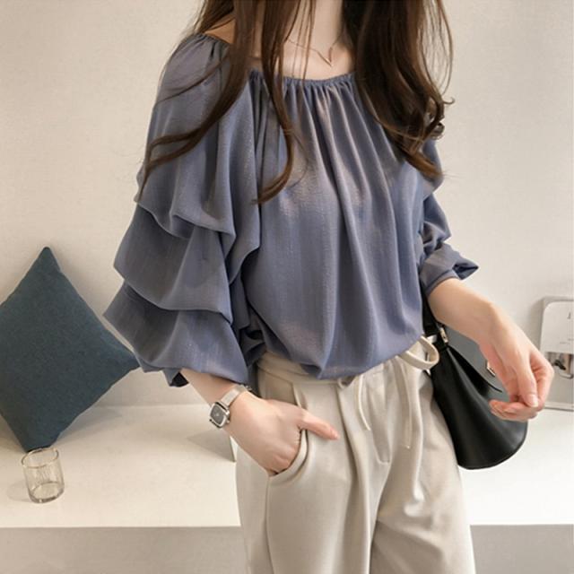 トップス シャツ ブラウス オフショル 2way シフォン 長袖 ゆったり ふんわり袖 袖コンシャス ティアード風 ギャザー くしゅくしゅ デザイン ランタンスリーブ ラウンドネック ルーズ ゆるかわ 体型カバー 大人可愛い かわいい 可愛い 大人魅せ 普段着 普段使い 着回し お出