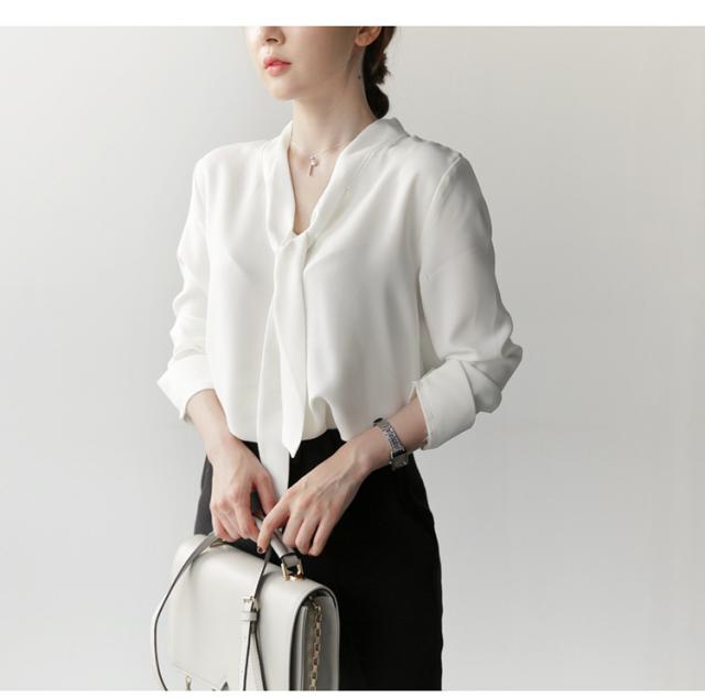 ボウタイ ブラウス リボン シャツ レディース 白 長袖 無地 Vネック トップス オフィス 通勤 春 秋 韓国 ビジネス デート 大人 可愛い リクルート OL お出かけ 上品 袖あり 就活 入園式 おしゃれ きれいめ シンプル カジュアル フォーマル エレガント 学生 普段使い 着回し