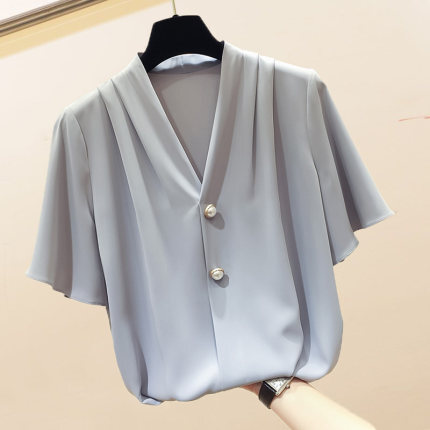 シャツ ブラウス 深Vネック 半袖トップス 袖フレア 裾バルーン レディース オフィス 韓国 白 パール ボタン 二の腕カバー 大人 かわいい おしゃれ こなれ感 きれいめ 清楚 学生 通学 着回し 普段使い OL 通勤 ママ マタニティ モテ デート フェミニン フォーマル 春 夏 秋