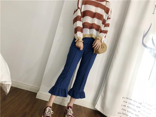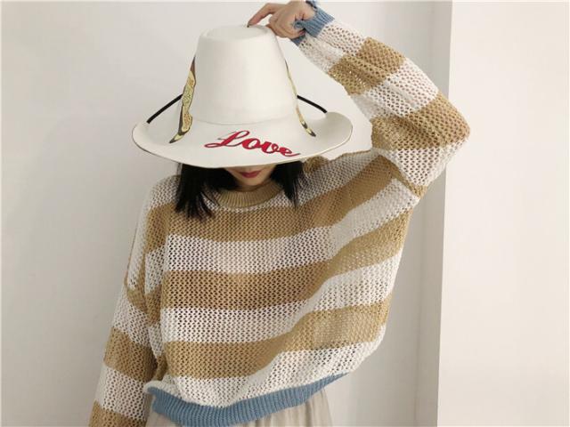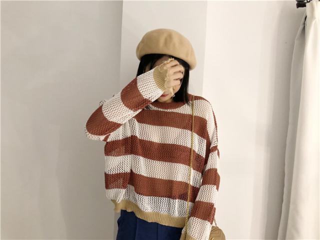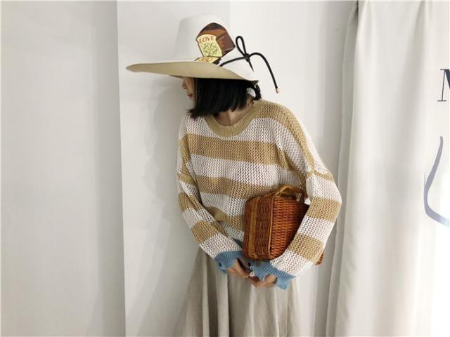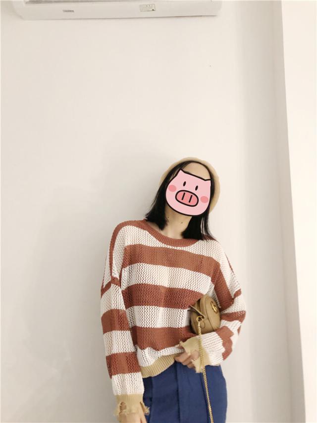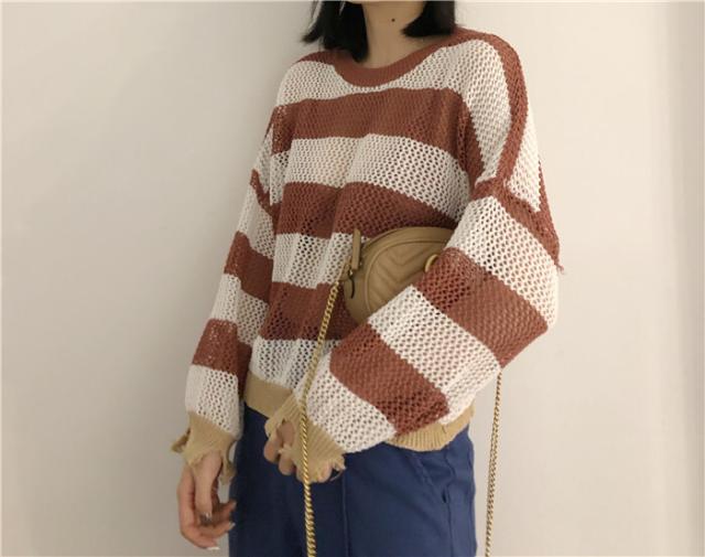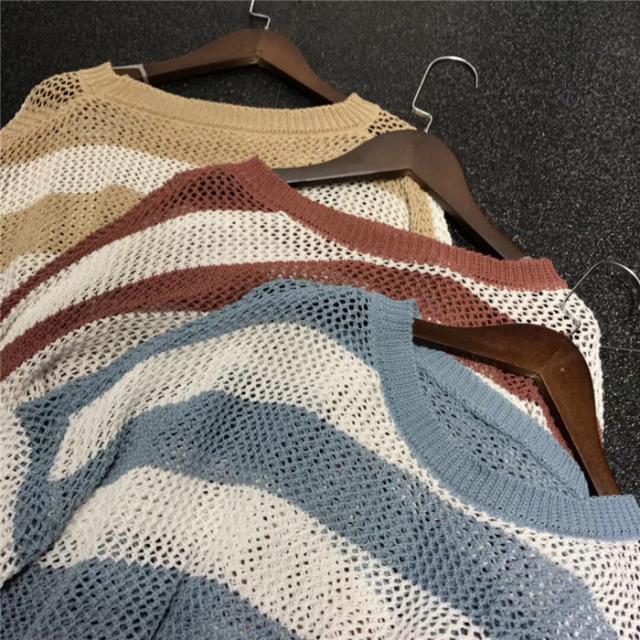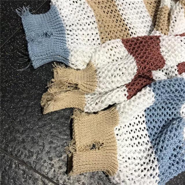 ダメージデザインの透かし編みボーダー柄ニットセーター♪
