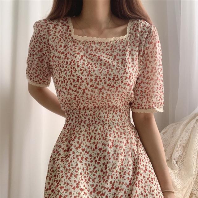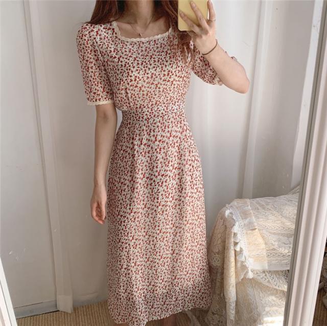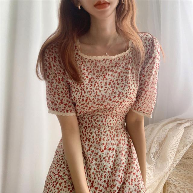 レースステッチ半袖ワンピ ワンピース ロング マキシ 半袖 スクエアネック Aライン レース かわいい 上品 レトロ ラブリー キュート ガーリー 花柄 小花柄 フラワー 春 夏 10代 20代 デート お出かけ 女子会 休日 韓国 韓国系 オルチャン フリーサイズ 白 ホワイト 赤 レッド