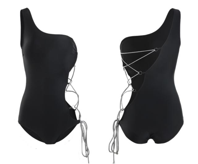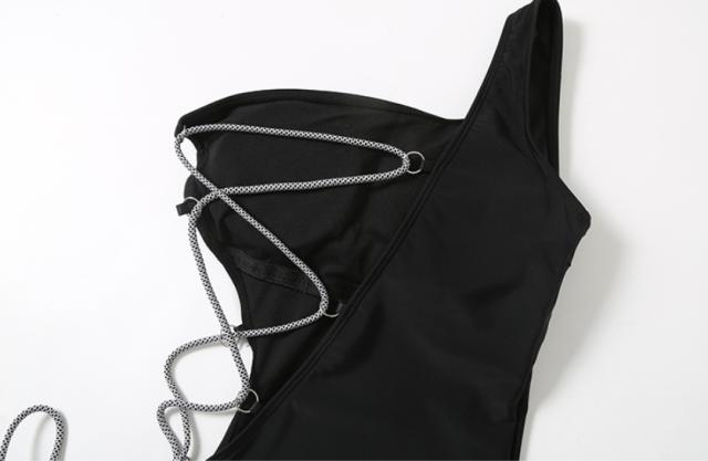 ワンショルダー サイドレースアップ 片側オープン ワンピース水着 レディース スイムウエア モノキニ風 編み上げ アシンメトリー パッド付き 肌見せ 胸元開き 谷間魅せ シンプル セクシー 大人かっこいい クール 女っぽ 存在感 無地 インスタ映え リゾート 海 セレブ風 黒