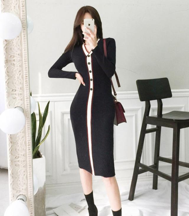 Vネックのタイトなニットワンピ♪