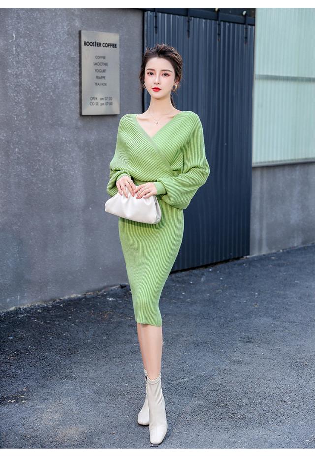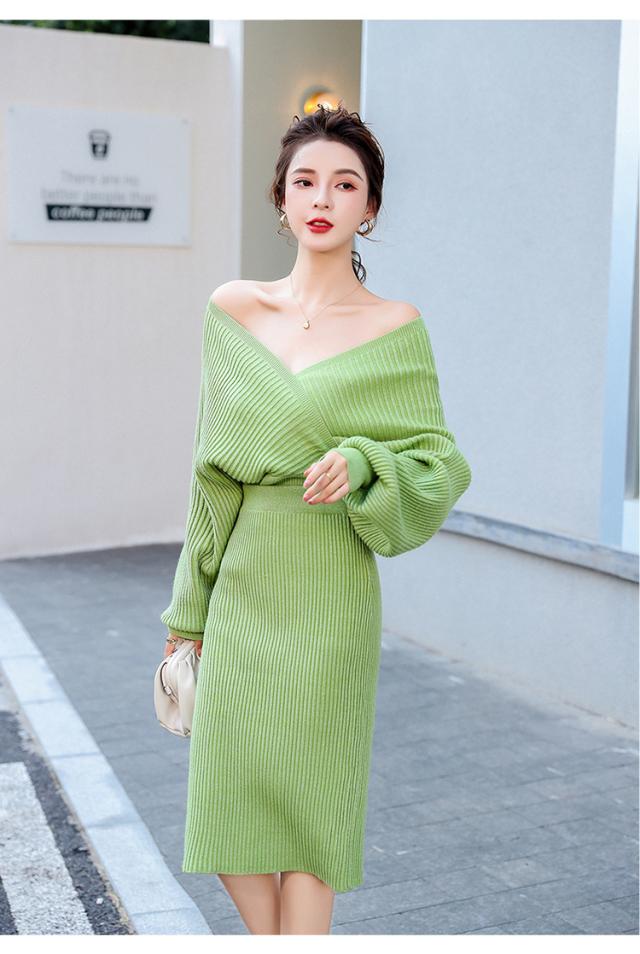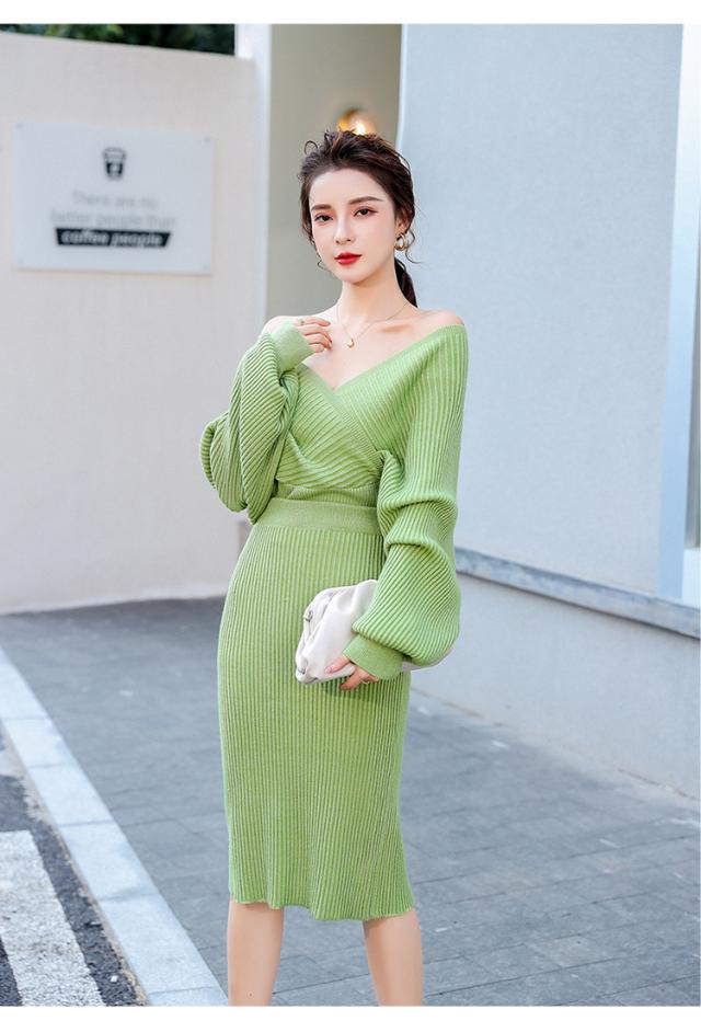 セットアップ リブ Vネック オフショルダー 2way レディース 上下 2点セット ニット トップス カシュクール ドルマンスリーブ 長袖 スカート タイト ミディ丈 ミモレ丈 膝丈 ひざ下 ハイウエスト 伸縮性 きれいめ シンプル カジュアル 大人っぽ おしゃれ デート お出かけ 緑