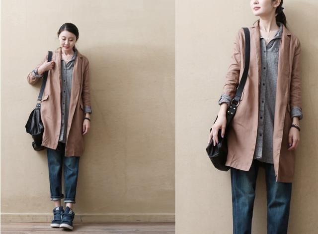 春 コート スプリングコート リネン 麻 ミドル丈 スリム スーツジャケット ジャケット バックル 襟付き ボタン ポケット付き 通勤 通学 お出かけ 普段着 普段使い 着回し M L グレーブルー 灰色 オレンジブラウン 茶