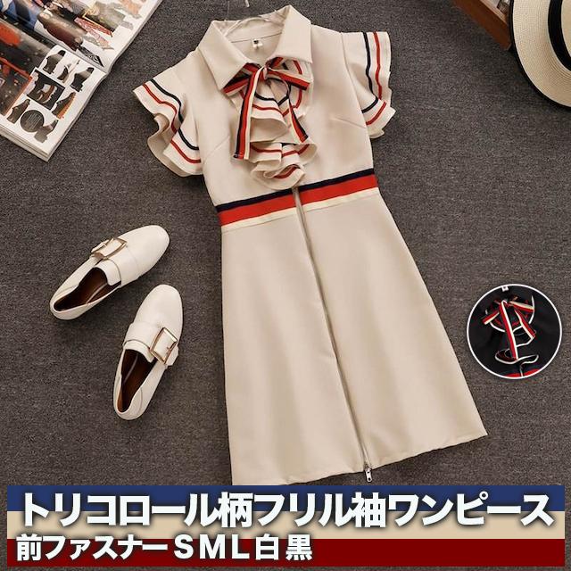 トリコロール柄ワンピ ワンピース 襟あり フリル レース リボン トリコロール Aライン ファスナー ジッパー かわいい 上品 レトロ 大人可愛い S M L ホワイト 白 ブラック 黒 春 夏 秋 お揃い 双子 韓国 韓国系 オルチャン