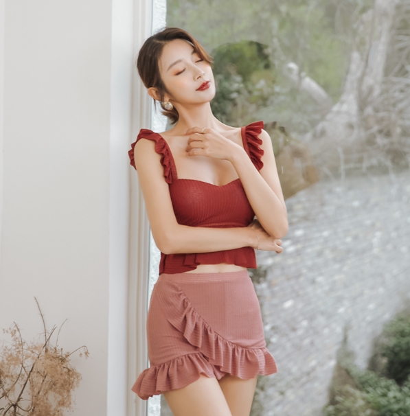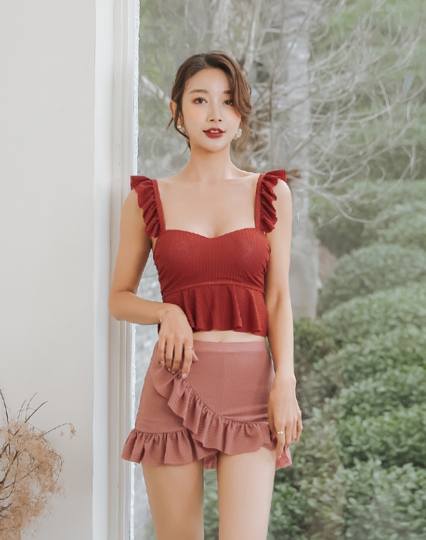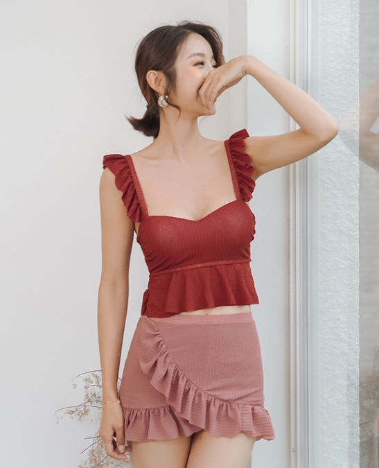 ビキニ 赤 レディース 無地 夏 セクシー セパレート フリル 体型カバー水着 肩フリル 胸元 谷間 スタイルアップ 上下 セット 可愛い 暖色 華やか 大人っぽい クール レトロ 無地 海 ビーチ プール リゾート 女子会 目立つ インスタ映え 男うけ 合わせやすい 着やすい