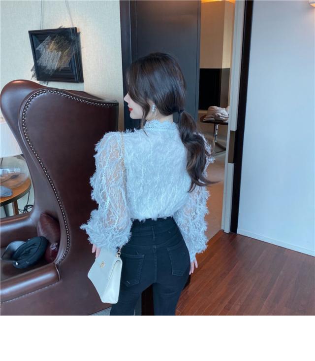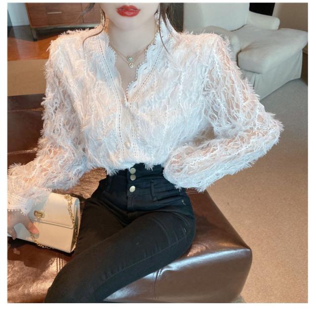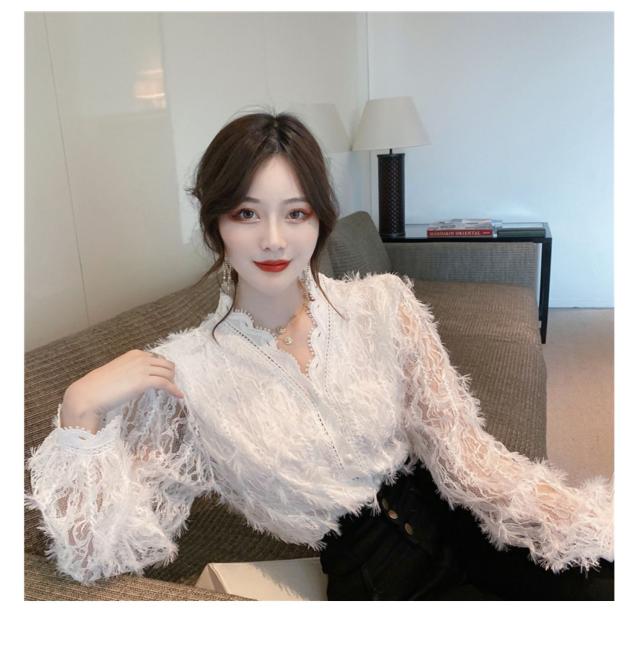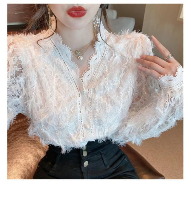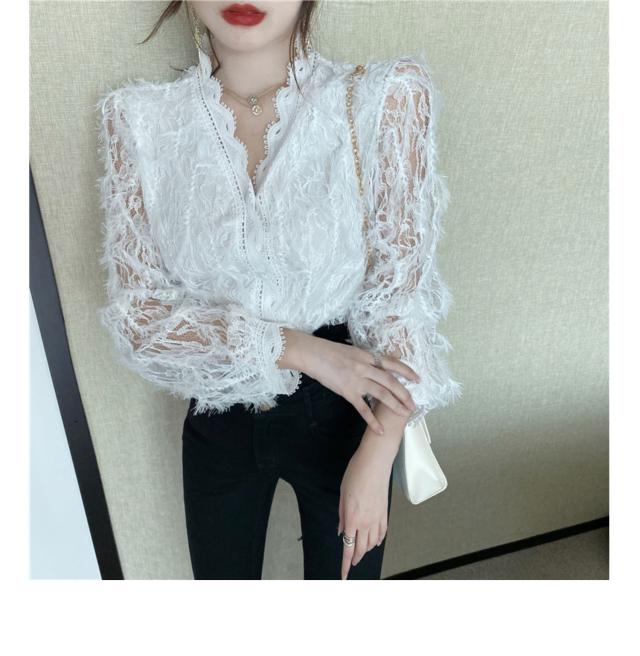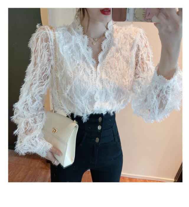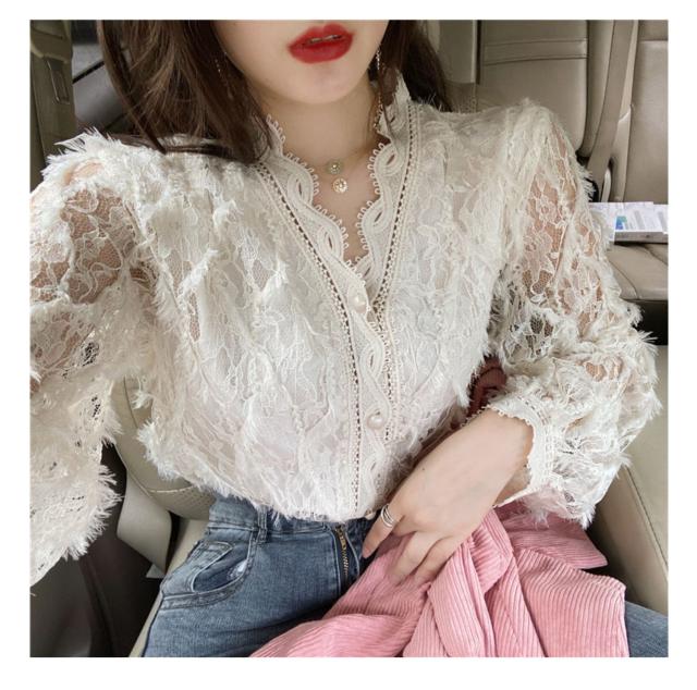 ブラウス 長袖 レディース 白 トップス Vネック レース パール ボタン パフスリーブ 前開き 透け感 きれいめ 可愛い シンプル カジュアル おしゃれ 着痩せ 細見え 着回し 合わせやすい おうち時間 休日 デート お出かけ お呼ばれ 旅行 女子会 パーティー イベント 通勤 通学