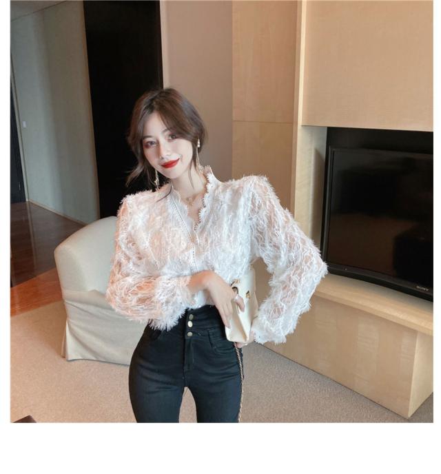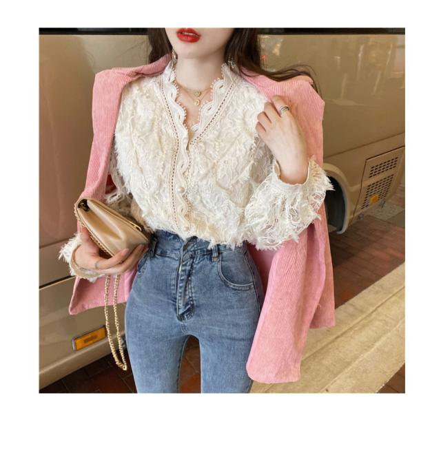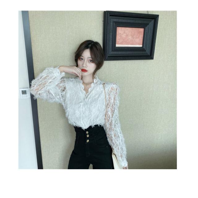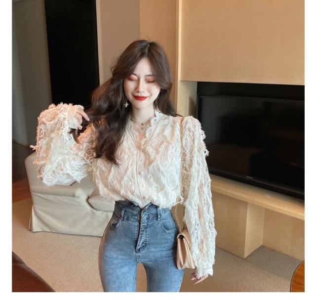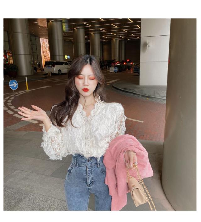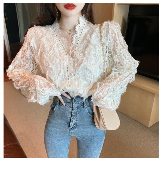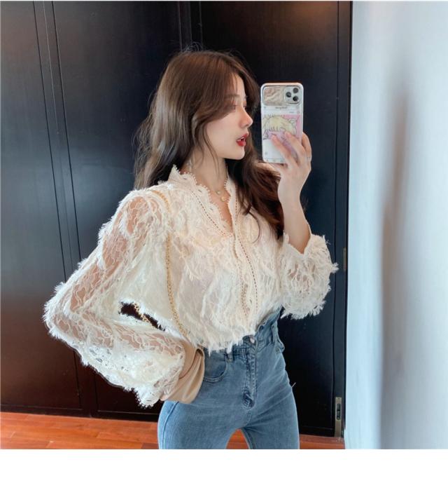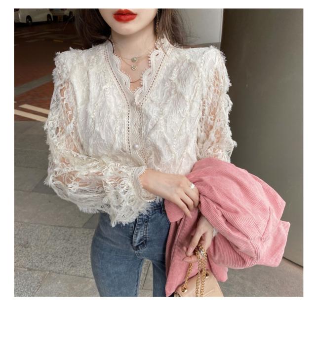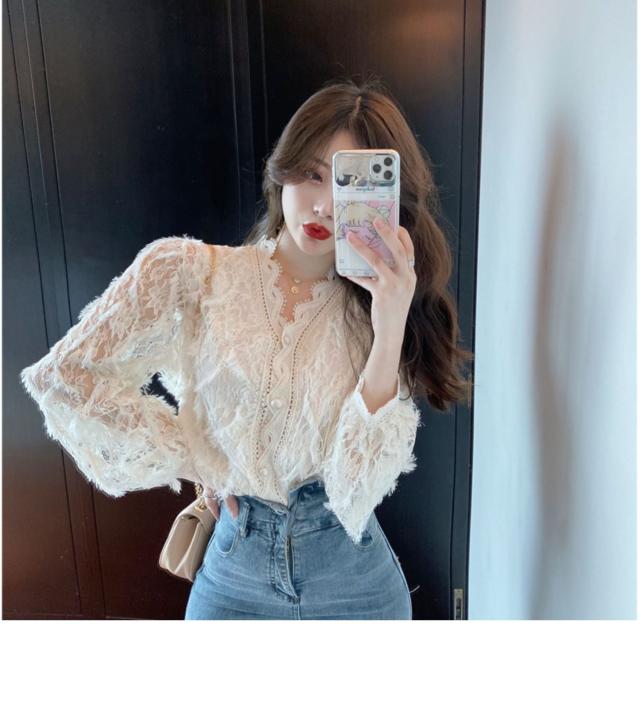 トップス ボトムス 白トップス 袖あり 長袖 襟なし Vネック スリム 細身 レース 前開き 透け感 材質 綿 キュート セクシー こなれ感 お洒落 春 夏 10代 20代 デート お泊り 女子会 イベント 買い物 旅行 インスタ映え 色 展開 ホワイト アプリコット サイズ ワンサイズ