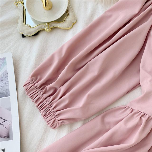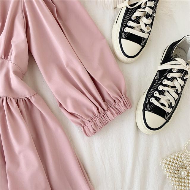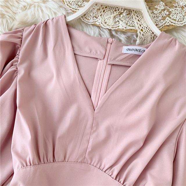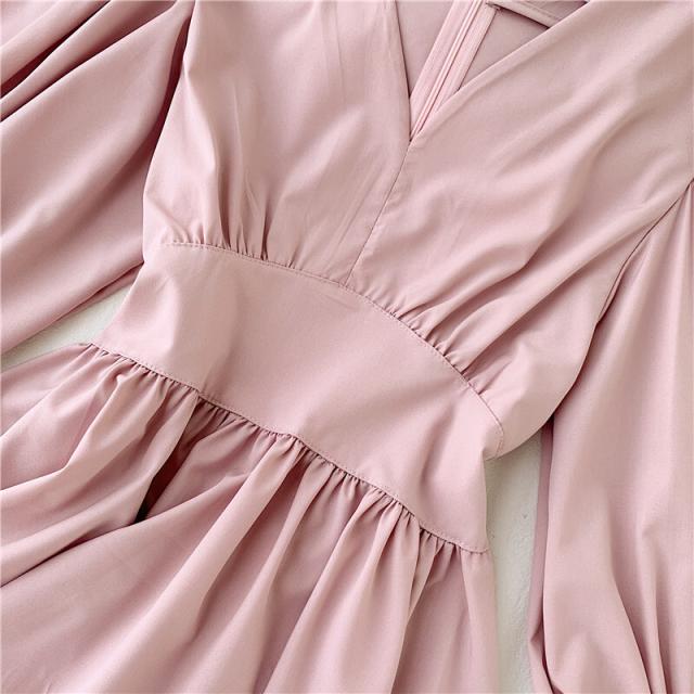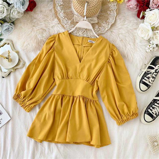 ワンピース ミニ スカート ミニ丈 膝上 袖あり 長袖 Vネック 襟なし ふわふわ ウエストゴム 伸縮性 シンプル カジュアル お洒落 セクシー 無地 春 夏 秋 10代 20代 レディース 女性 OL 通勤 デート お出かけ 旅行 普段使い 楽ちん カラー ピンク イエロー グリーン ホワイト ブラック レッド サイズ ワンサイズ
