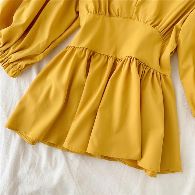 ブラウス レディース ホワイト ブラック トップス 長袖 Vネック フレア ペプラム ウエストマーク ゴム 伸縮性 春 夏 秋 きれいめ かわいい シンプル カジュアル おしゃれ 着痩せ 細見え 着回し 合わせやすい おうち時間 休日 デート お出かけ お呼ばれ 旅行 女子会 通勤 通学