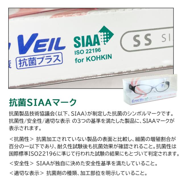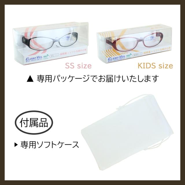 | 商品詳細 CLEARVEIL クリアヴェール CV07SSK SSサイズ 小学生高学年、顔の小さい方向け CV03KK キッズサイズ 幼児、小学生低学年向け ※あくまでも目安となりますので、サイズ詳細については下記を確認お願いします。 花粉や飛沫対策に!!花粉メガネ 抗菌プラス 抗菌SIAAマーク くもり止め加工レンズ レンズが曇りにくいため、マスクを着用時でも快適に過ごせます。 UV99%カット UV(紫外線)を99%以上カット!!紫外線から目を守ります。 調整可能なラバーモダン 耳にかける部分(モダン)は芯入りになっていますので、自由に調整が可能です。 また、ラバー製ですので、滑りにくくなっています。 (中国製) | |