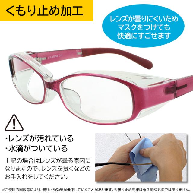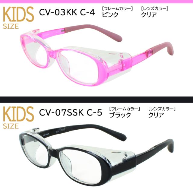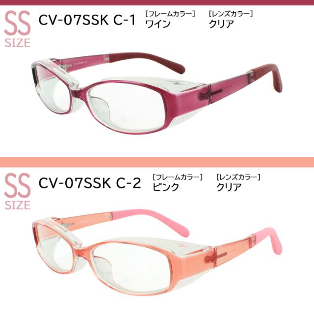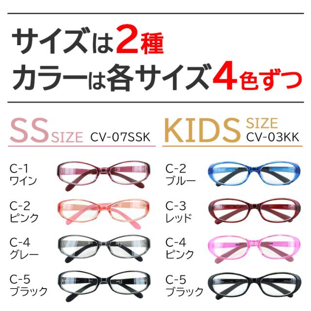 | ●フレームカラー SSサイズ CV07SSK C-1 ワイン C-2 ピンク C-4 グレー C-5 ブラック キッズサイズ CV03KK C-2 ブルー C-3 レッド C-4 ピンク C-5 ブラック ●レンズカラー(全色共通) クリア | ●素材 フレーム:プラスチック(TR90) レンズ:プラスチック (PVC) ●仕様 くもり止め加工 UV99%カット 調整可能ラバーモダン ●抗菌部分 フロント/テンプル/モダン |