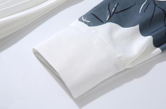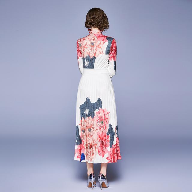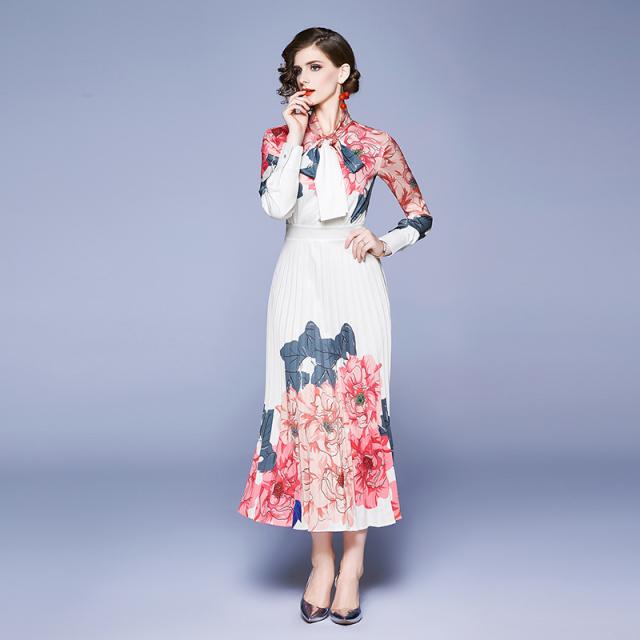 フラワープリントドレス ドレス パーティードレス ロングドレス ステージドレス 舞台衣装 ロング ロング丈 袖あり 長袖 Aライン プリーツ リボン きれいめ 上品 おしゃれ アジアン チャイナ風 花柄 小花柄 フラワー レディース パーティー イベント 高見え シーズンレス M L XL 2XL 白 ホワイト