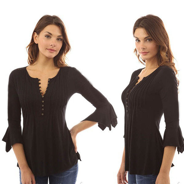 トップス レディース Tシャツ 7分袖 袖あり ペプラム 胸元 綿 コットン ラウンド V ネック ボタン フレア袖 スリム 無地 大きい サイズ シンプル 2XL 3XL おしゃれ お出かけ デート 大人 かわいい 大人女子 通勤 通学 学生 旅行 休日 普段着 着回し 10代 20代 30代 黒 白