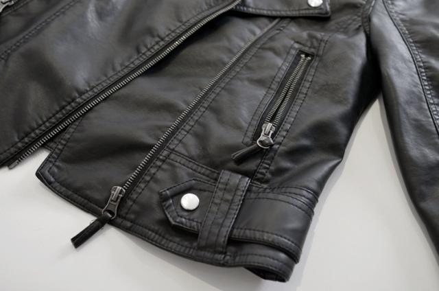 レディース アウター レザー ジャケット 人気 通販 厚手 ライダース バイク ショート丈 暖かい あったか 襟付き ジッパー ファスナー ボタン ポケット付き 長袖 袖あり クール かっこいい メンズライク マニッシュ スリム 辛口 おしゃれ コーデ 通勤 通学 デート お出かけ 黒