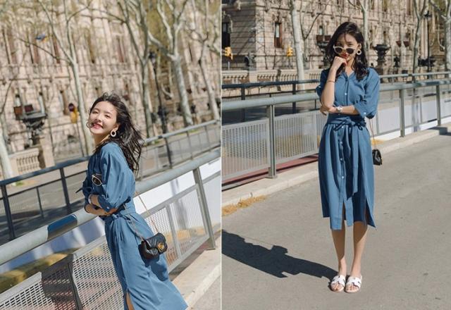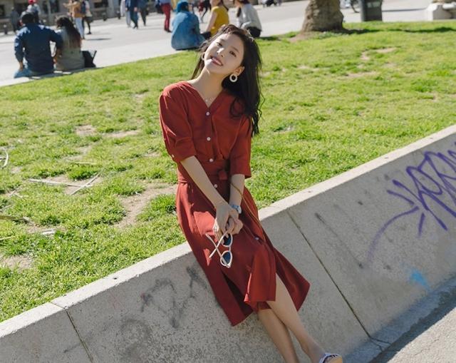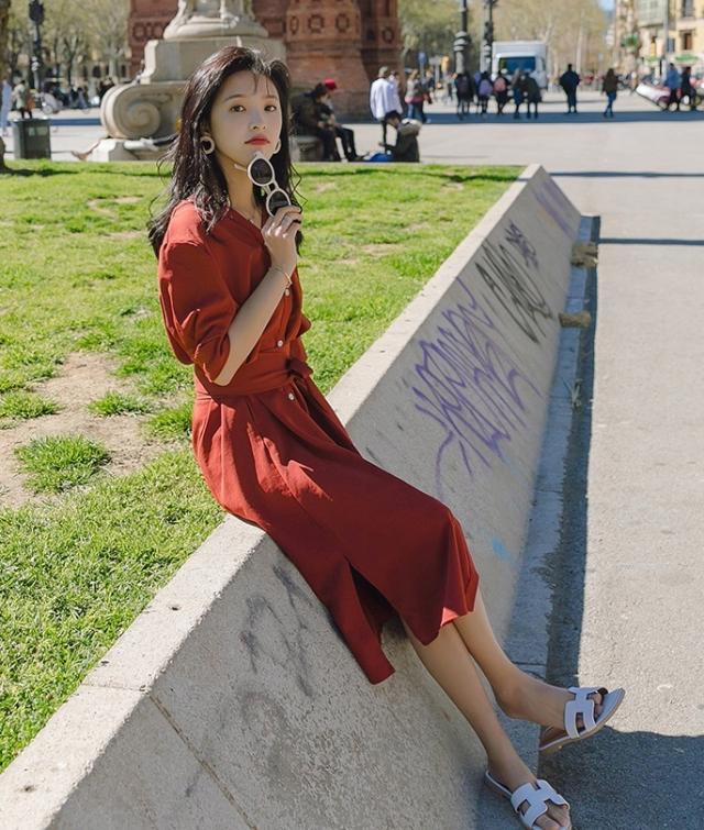 くすみカラーが大人魅せしてウエストリボン結びでマークすれば美シルエットに♪