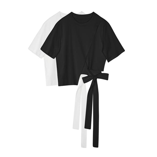 トップス Tシャツ ショート丈 ラウンドネック クルーネック バックリボン バックコンシャス 半袖 無地 個性的 大人可愛い カジュアル フェミニン ガーリー シンプル 女子会 お出かけ デート デイリー 春 夏 秋 10代 20代 30代 S M L ホワイト ピンク ブラック