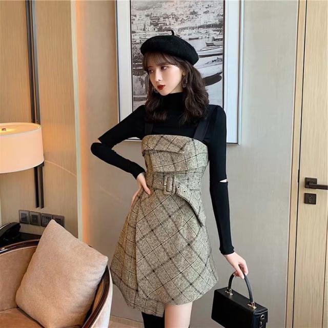 レディース2点セット カットソー ジャンパースカート チェック柄 ウエストベルト ウエストマーク イレギュラーヘム 膝丈 ミディ丈 長袖 ハイネック 大人可愛い おしゃれ お洒落 ガーリー キュート 大人女子 ラブリー 学生 大学生 通学 キャンパスコーデ デート お出かけ イベント 女子会 着回し お得 サイズ展開 S M L XL