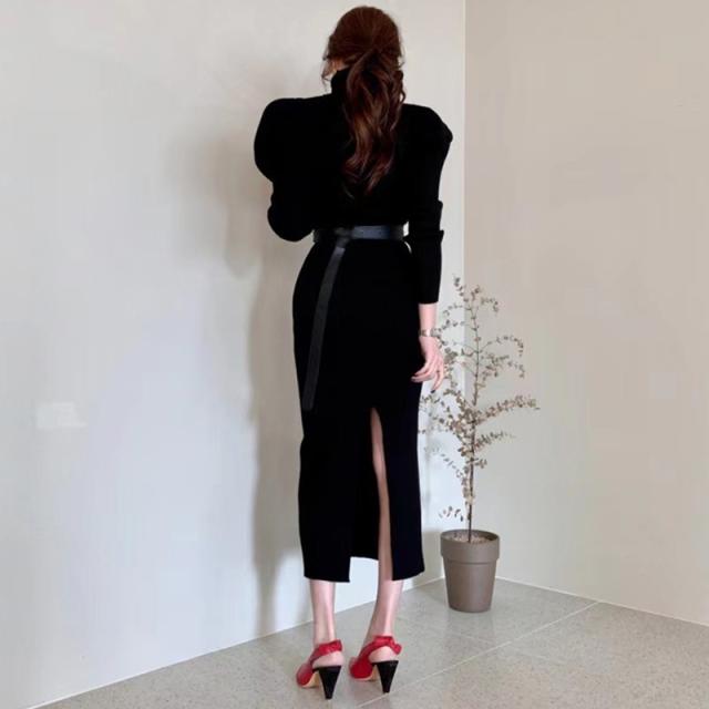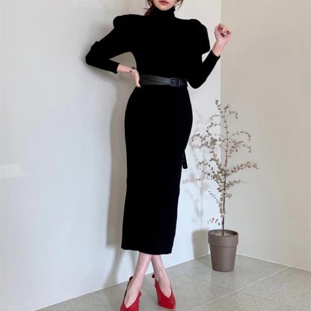ハイネックスリムセーターワンピ ワンピース セーター 膝丈 ひざ丈 袖あり 長袖 パフスリーブ タートルネック タイト 大人可愛い きれいめ シンプル 上品 おしゃれ こなれ感 フォーマル 無地 秋 冬 20代 30代 40代 デート お出かけ 女子会 休日 パーティー イベント 普段使い フリーサイズ 黒 ブラック