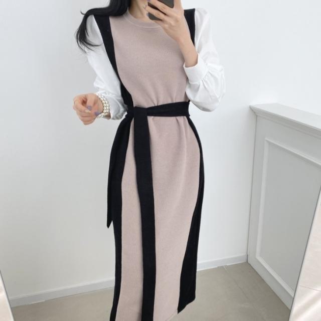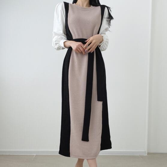 ワンピース 異素材MIX カラー 配色 ミモレ丈 レディース シャツ ニット ドッキング デザイン 長袖 袖あり ラウンドネック ハイウエスト ウエストマーク ベルト 腰ひも付き 重ね着風 レイヤード風 レディース ファッション 大人 上品 フェミニン 大人女子 レディライク 大人可愛い かわいい 可愛い 通勤 通学 お出かけ デート 旅行 休日 女子会 普段使い 10代 20代 春 秋 ワンサイズ ブラック 黒 ブラウン 茶色