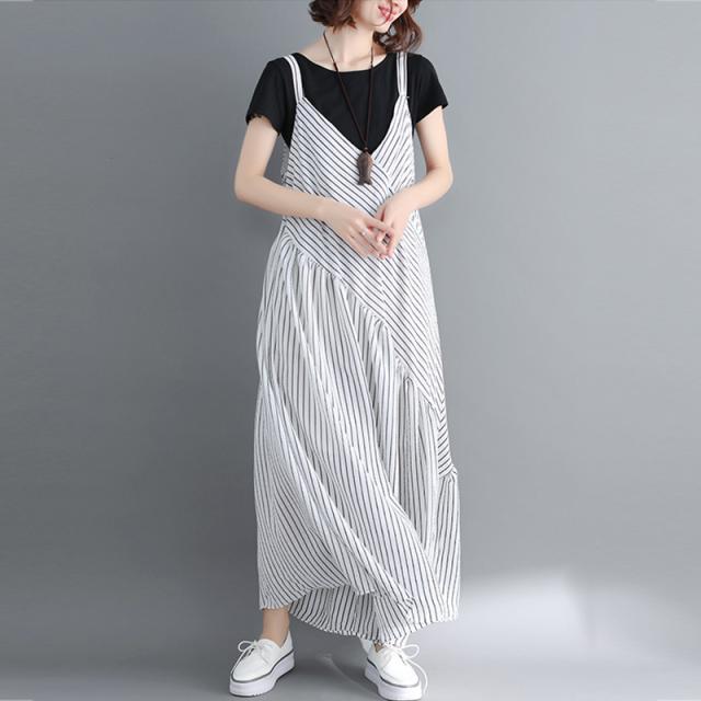 サロペット ワイド パンツ レディース オールインワン マキシ丈 ストライプ ふんわり ゆったり オーバーサイズ ゆるめ 体型 カバー キャミワンピ風 ななめ切り替え Vネック シンプル カジュアル 大人 可愛い レイヤード 重ね着 普段使い お出かけ 春 夏 大きいサイズ 白 黒