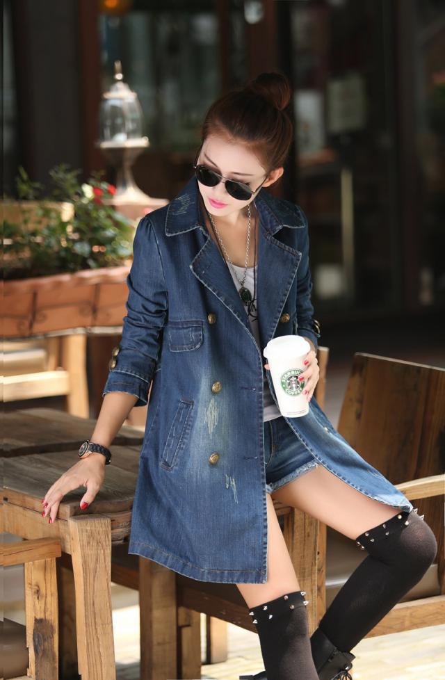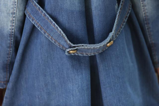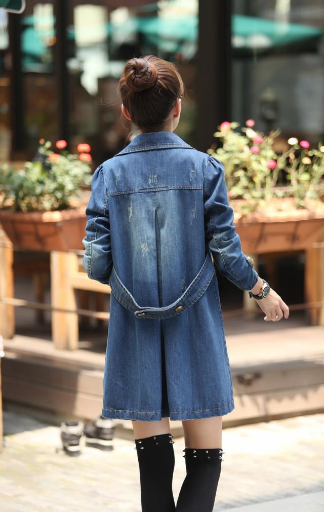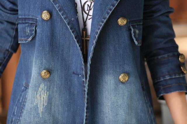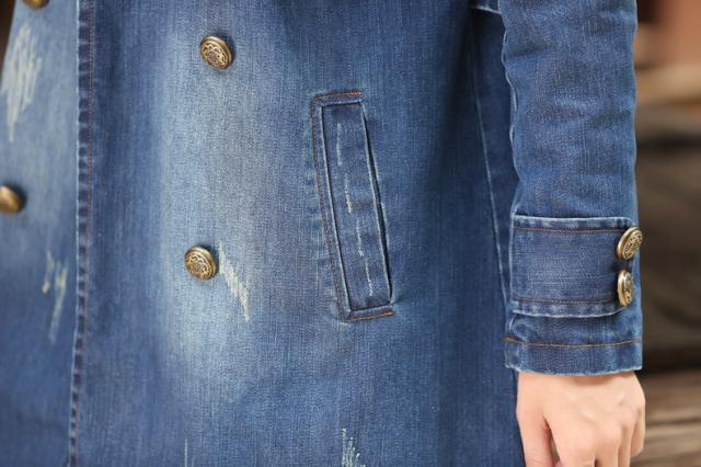アウター デニム ジャケット ジージャン ダブルブレスト コート レディース ダメージ加工 ダブルボタン 装飾ボタン 膝上 チュニック丈 ミドル丈 ジーンズ生地 綿 コットン 長袖 襟付き バックベルト ポケット付き カジュアル シンプル おしゃれ 青 大きいサイズ 2XL 3XL 4XL