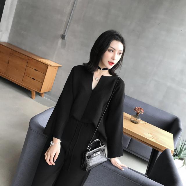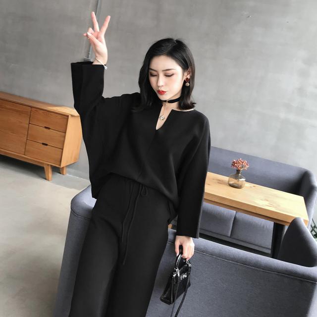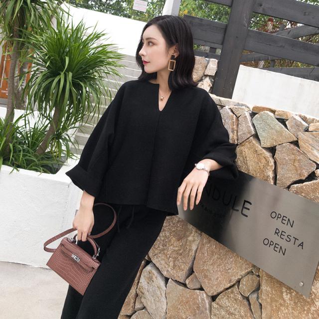 トップス ボトムス 2パターン Vネック ニット セーター 長袖 袖あり バットスリーブ ドルマンスリーブ ゆったり こなれ感 カジュアル パンツ ワイドパンツ クロップドパンツ 大人 上品 シンプル 9分丈 ワイド アクリル 無地 ラフ 休日 通勤 着回し 普段使い お出かけ 旅行 ママ レディース ファッション 20代 30代 小さめ 小さいサイズ XS M ブラック 黒 コーヒーブラウン 茶色
