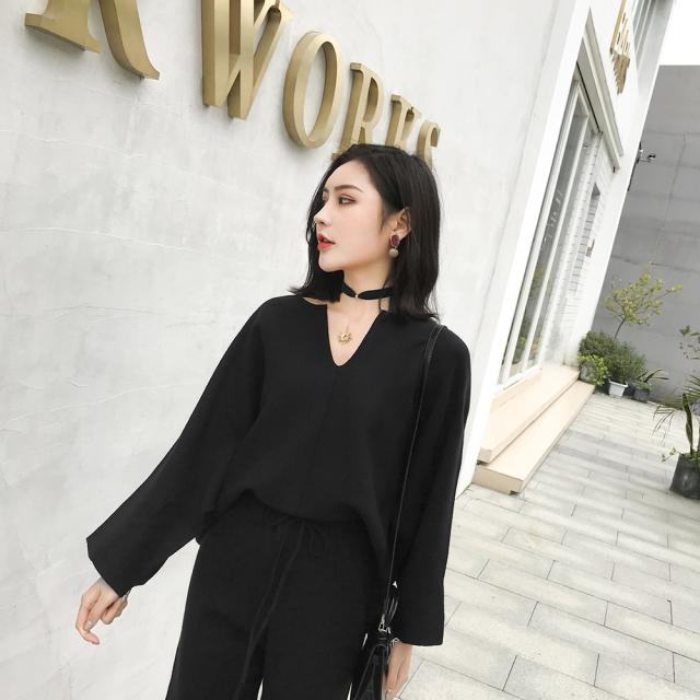 トップス ボトムス バラ売り キーネック ニット セーター ゆったり オーバーサイズ ルーズフィット 長袖 体型カバー ドルマンスリーブ こなれ感 ワイドパンツ クロップド丈 足首見せ ウエストドロスト 細身向け シンプル カジュアル リラクシー上品 アクリル 普段使い 黒 茶