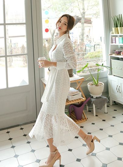 ワンピース シャツワンピ 総レース 透け感 花柄 幾何学模様 ソフトマーメイド 裾フレアフリル ミモレ丈 ロング丈 レディース リボンベルト ウエストマーク 長袖 前ボタン シンプル フェミニン きれいめ セクシー 大人 可愛い 脚長効果 韓国風 普段使い デート 白 緑 春夏