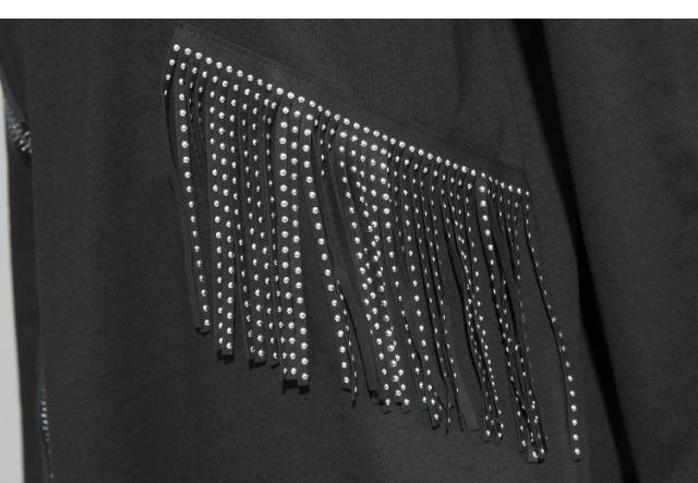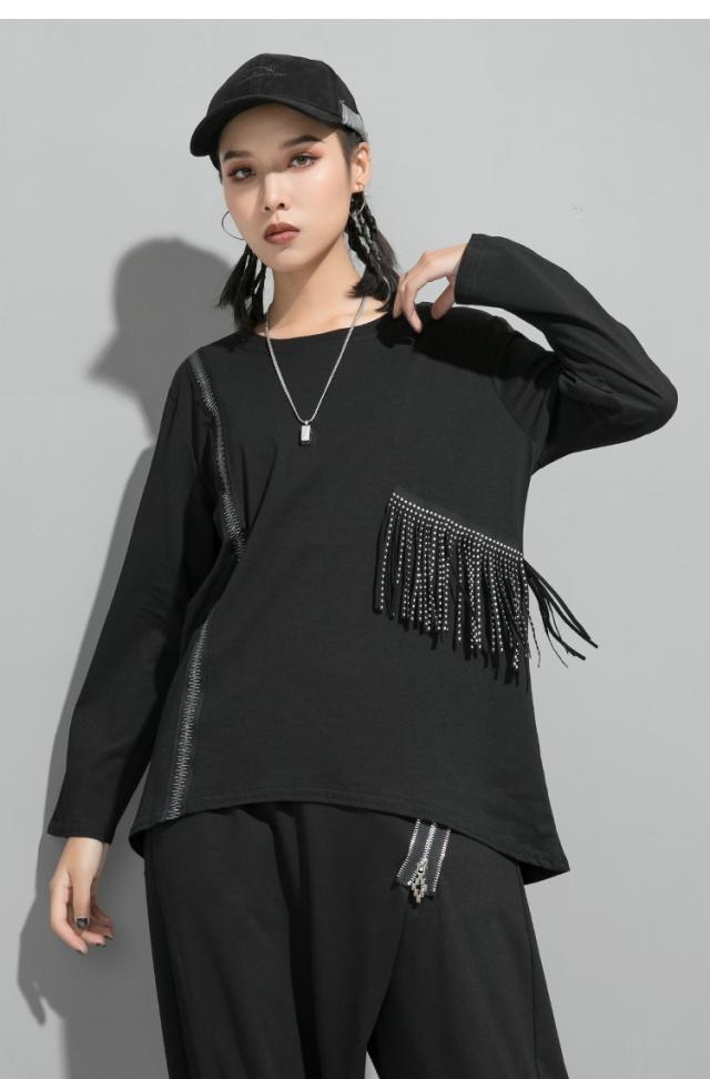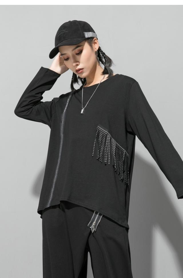 レディースロングTシャツ 長袖 クルーネック フリンジ ステップドヘム プルオーバー トップス カットソー 春 秋 おしゃれ お洒落 かっこいい メンズライク ボーイッシュ 個性的 クール モード系 存在感 バンギャ V系 ライブハウス フェス ライブイベント バンドロック パンク お出かけ 女子会 インスタ映え 通学 キャンパスコーデ カラー ブラック サイズ M L